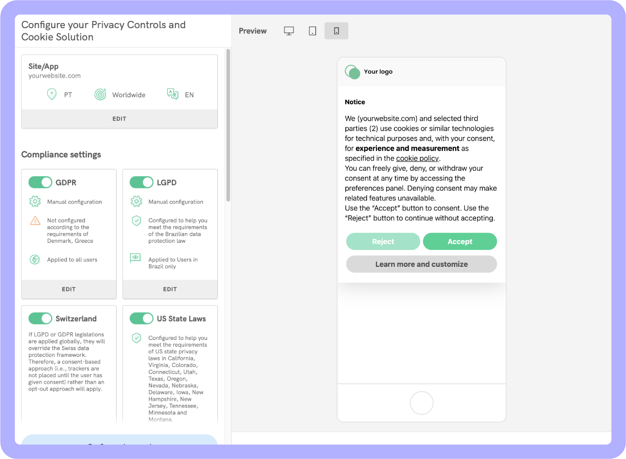 It’s policies, banners, terms, consent, and accessibility all working together. We’ve built a smart suite of privacy tools that update automatically as laws change, wherever you operate.